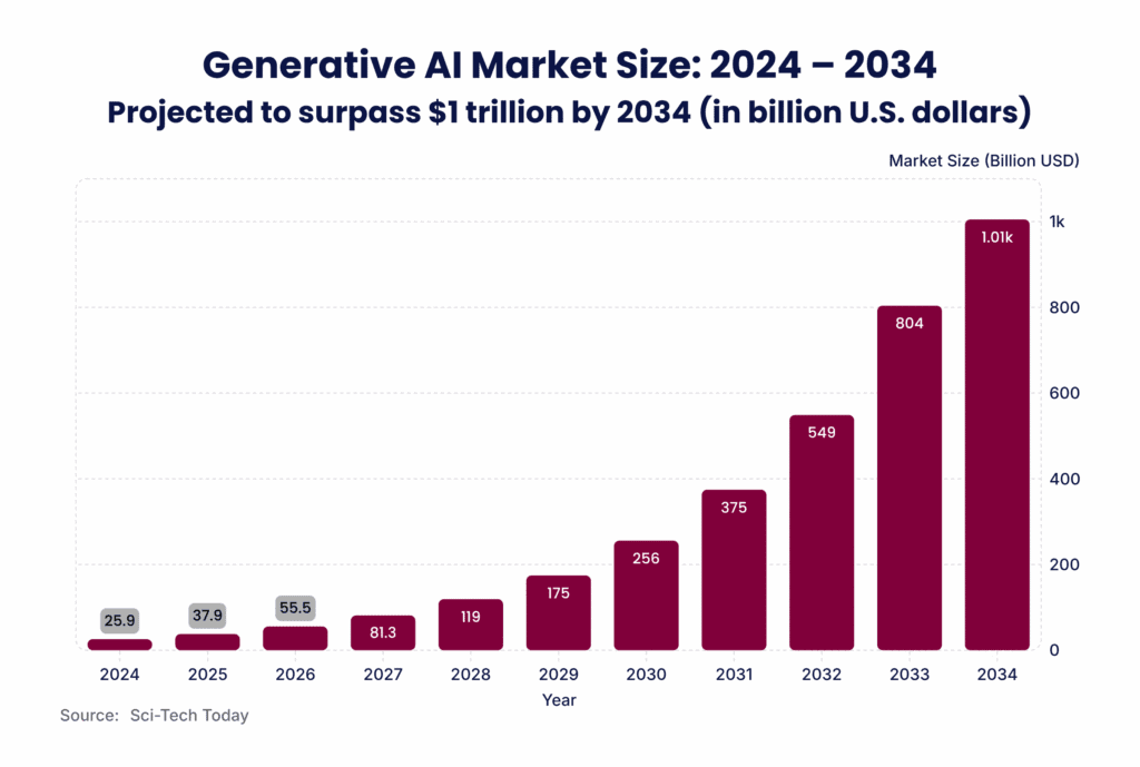 According to Sci-Tech Today, the global Generative AI market – which has doubled in the past two years – is projected to grow from USD $55 billion in 2026 to over USD $1 trillion by 2034.