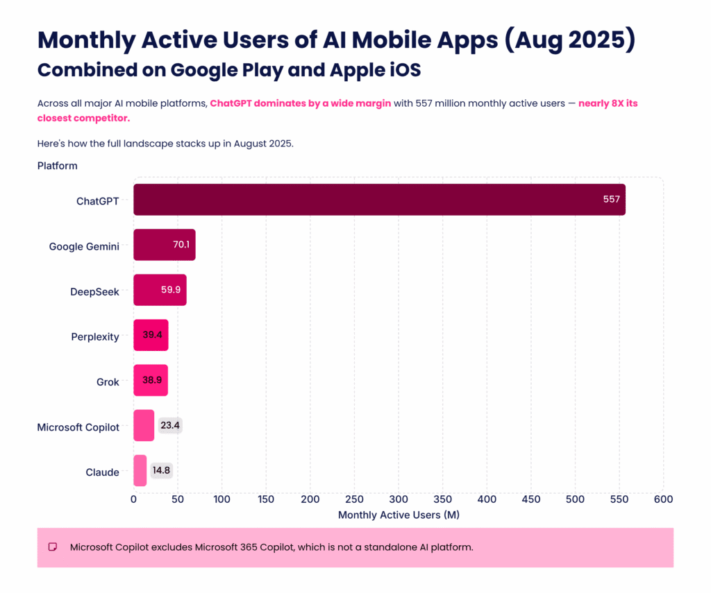 Across all major AI mobile platforms, ChatGPT dominates by a wide margin with 557 million monthly active users — nearly 8X its closest competitor.