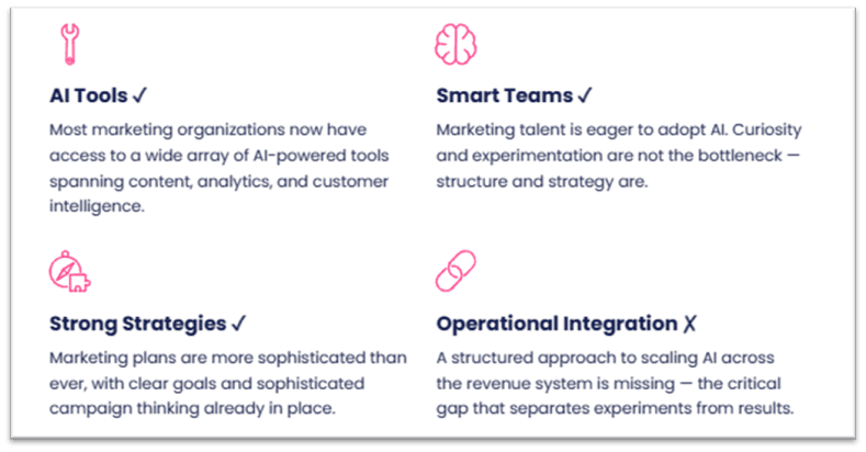 They have AI tools, smart teams, and strong marketing strategies, but they lack a structured approach to implementing AI across the revenue system.